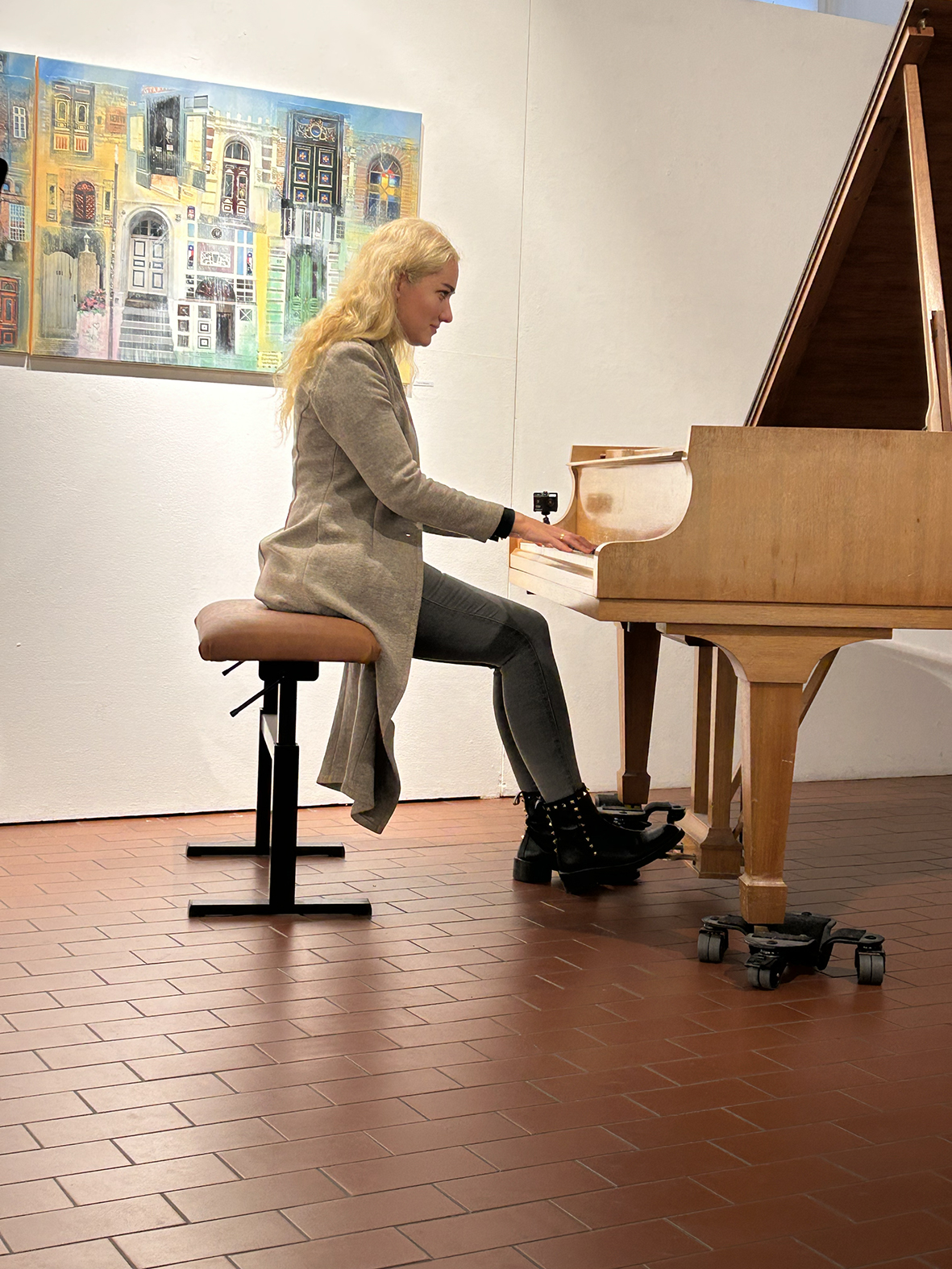 Nach den Unwägbarkeiten im Vorfeld der Ausstellung, konnte tatsächlich wieder eine Vernissage stattfinden, wenn auch mit Einschränkungen. So wurde die Rede von Prof. Karl-Heinz Lohmann per Video auf eine Leinwand übertragen und auch die Musikerin Jennifer Hymer ließ ihre spielenden Hände am Klavier filmen und als Video via Bildschirm auf dem Flügel in Dauerschleife abspielen.