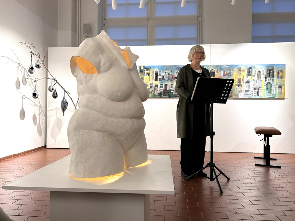 Sabine Rheinhold, unsere 1. Vorsitzende, informierte über die Bedeutung der Kunstfördernden im Laufe der letzten 100 Jahre. Tilla Lingenberg trug eigene Texte vor und die Künstlerinnen der aktuellen Ausstellung „Klang der Welt“ stellten ihre Arbeiten vor. Es spielte die Pianistin Ana Miceva.