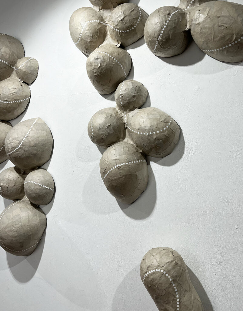 Aus Fundstücken, teils aus der Natur, teils aus dem Kreislauf des Weggeworfenen, entstehen vielschichtige Wandarbeiten. Jedes Element wird einzeln von Hand auf Leinwand genäht. So verdichten sich kleinste Dinge zu skulpturalen, beinahe körperhaften Kompositionen, die sich dem flüchtigen Blick entziehen.