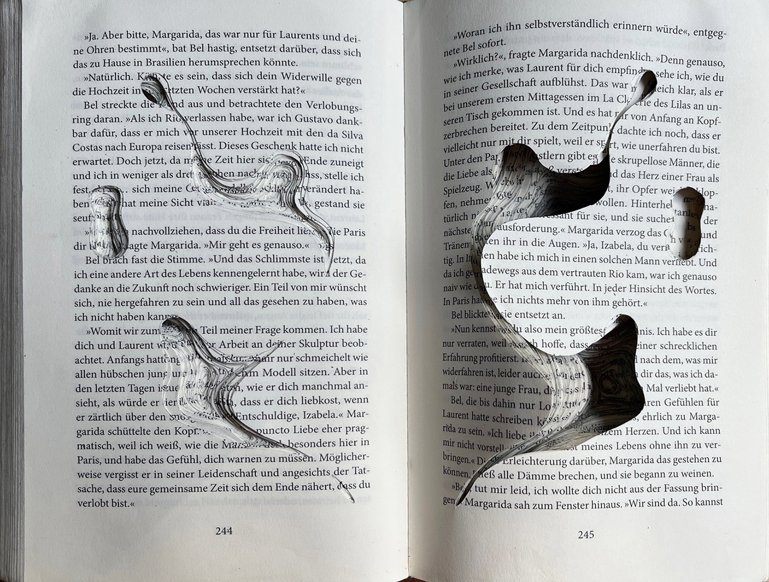 In einem Prozess aus Zerlegung und Neuordnung von textilen Fragmenten und Abdrücken aus Papier kristallisiert sich eine Essenz, die zu einem Objekt wächst. Evelin Marin zeigt bearbeitete Kleiderreste hinter halbtransparentem Glas und die Installation Hüllen im Stahlständer „fragile I-III“.