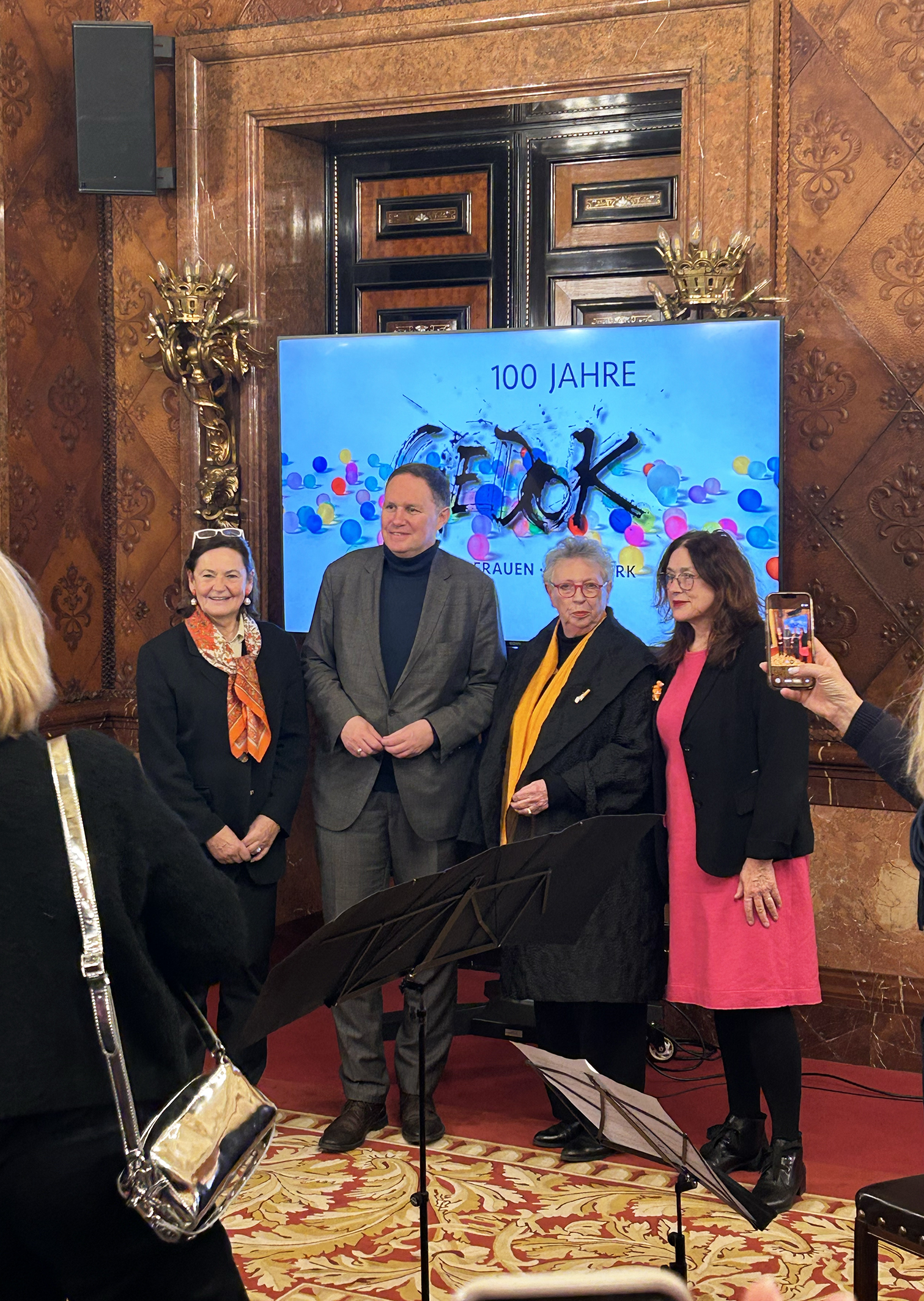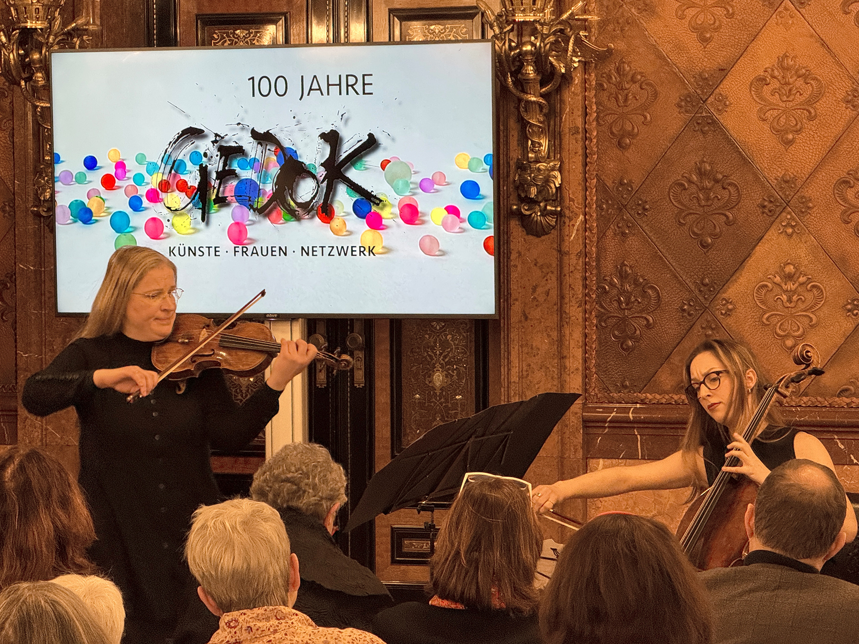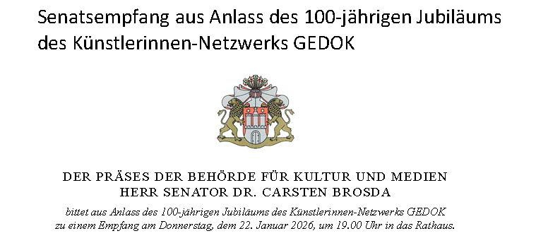 Sabine Rheinhold, 1. Vorsitzende der GEDOK Hamburg: „Der Bürgermeistersaal im Rathaus war vollbesetzt, die Gespräche im Anschluss bei Wein und Laugengebäck so interessiert wie locker. Carsten Brosdas Rede – wie immer mit Witz und durchaus ernsthaften Zwischentönen – war geprägt von Würdigung und Wertschätzung der GEDOK. Das klang auch so in den Reden von Monika Griefahn, langjährige Leiterin des Kulturausschusses im Bundestag, sowie der Begrüßung der GEDOK-Präsidentin Béatrice Portoff, die auch das Grußwort der Schirmherrin des GEDOK-Jubiläums überbrachte. Das Video zur Geschichte der GEDOK (Nanette Zimmermann, GEDOK Freiburg) zeichnet in gleichermaßen poetischen wie grafisch knappen Bildern zugleich ein Porträt der Gründerin Ida Dehmel. Musikalisch bereicherten den Abend Ewelina Nowicka mit einer eigenen Komposition, Marica Lemke-Kern mit einer Vorführung für Gesang, Kristallgläser und Kieselsteine sowie Henrika Grassau und noch einmal Ewelina Nowicka mit Rebecca Clarkes „Lullaby“.“