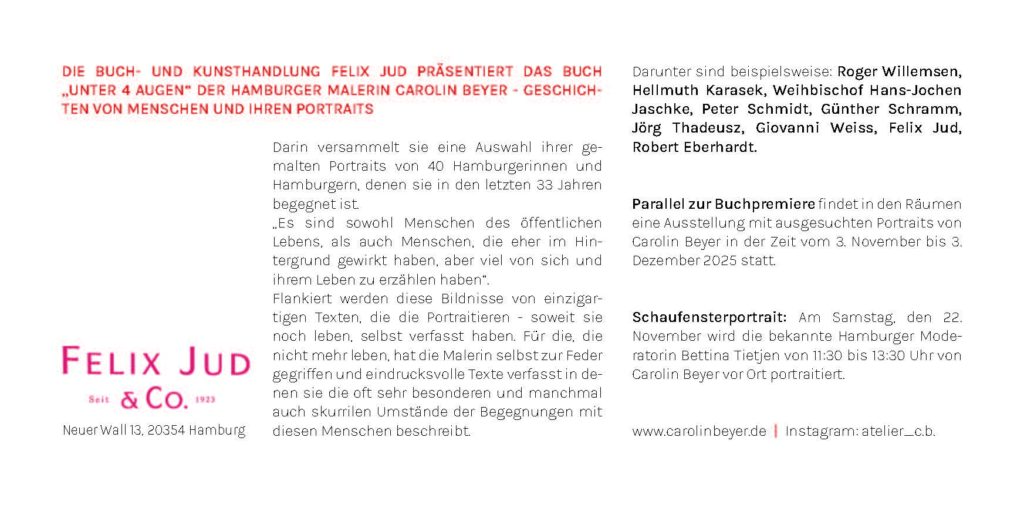 Am Samstag, den 22. November 2025, von 11.30 – 13.30 Uhr wird die bekannte Hamburger Moderatorin Bettina Tietjen exklusiv von Carolin Beyer im Hauptschaufenster der Buch- und Kunsthandlung Felix Jud portraitiert