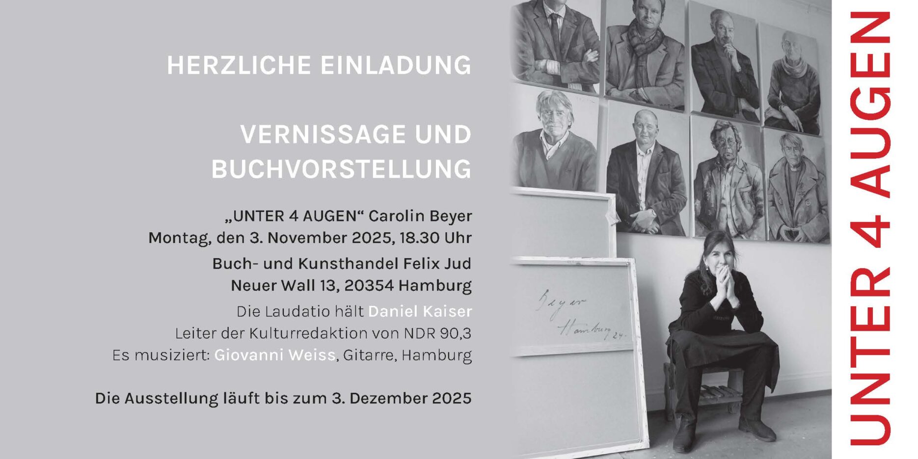 Portraits sind die Spezialität der Hamburger Malerin Carolin Beyer. In ihrem Buch „Unter 4 Augen“ versammelt sie jetzt 40 ihrer Bilder aus den vergangenen 33 Jahren. Man sieht Bildnisse von so bekannten Menschen wie Roger Willemsen, Hellmuth Karasek, Weihbischof Hans-Jochen Jaschke, Peter Schmidt oder Jörg Thadeusz. „Es sind sowohl Menschen des öffentlichen Lebens, als auch Menschen, die eher im Hintergrund gewirkt haben, aber viel von sich und ihrem Leben zu erzählen haben“, sagt Beyer. Flankiert werden diese Bildnisse von einzigartigen Texten, die die Portraitieren – soweit sie noch leben, selbst verfasst haben. Für die, die nicht mehr leben, hat die Malerin selbst zur Feder gegriffen und eindrucksvolle Texte verfasst, in denen sie die oft sehr besonderen und manchmal auch skurrilen Umstände der Begegnungen mit diesen Menschen beschreibt.